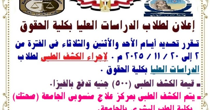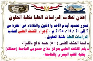 الطالب يتقدم باستمارة الكشف الطبى لمسئول الدبلومة عليها صورة شخصية ويتم ختمها والتوجه للكشف الطبى فى مواعيد الكشف فى الفترة من 2 / 2025/11 الى 2025/11/20م حسب الجدول الزمنى المعتمد من الجامعة.