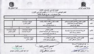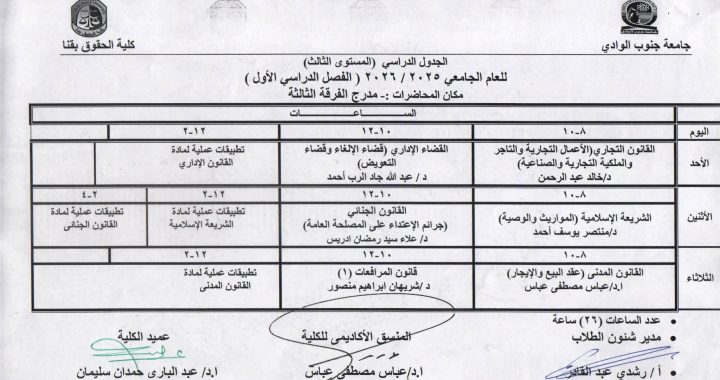 جدول المحاضرات للفرقه الثالثة للعام الجامعى 2025 / 2026م