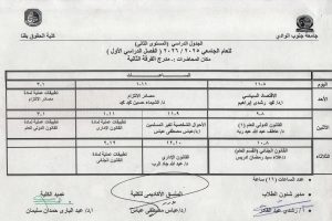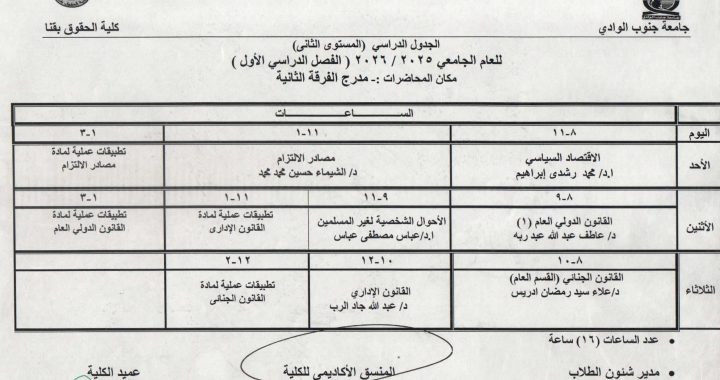 جدول المحاضرات للفرقه الثانية للعام الجامعى 2025 / 2026م