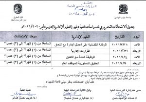 جدول امتحانات دبلوم العلوم الإدارية Posted on مارس 3, 2021مارس 3, 2021 جدول دبلوم الدراسات العليا الاربع