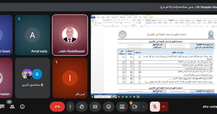 في إطار الاستعدادات المكثفة لانعقاد امتحانات نهاية الفصل الدراسي الأول بكلية الإعلام وتكنولوجيا الاتصال، وتحت رعاية الأستاذ الدكتور أحمد عكاوي رئيس جامعة قنا والأستاذ الدكتور / أشرف موسى نائب رئيس الجامعة لتعليم والطلاب. عقد الأستاذ الدكتور/ حسين عبدالباسط – عميد الكلية يوم الأحد الموافق 28 ديسمبر 2025م عبر تطبيق (Google Meet) اجتماعًا موسعًا مع رؤساء وأعضاء الكنترولات، وأعضاء غرفة الأسئلة، وبحضور الأستاذ الدكتور/ سمية عبد الراضي- مدير وحدة ضمان الجودة بالكلية؛ وذلك لمناقشة آليات الاستعداد للامتحانات وضمان انتظامها وفق القواعد واللوائح، ومعايير الجودة المعتمدة.