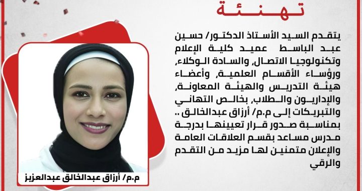 يتقدم السيد الأستاذ الدكتور / حسين عبد الباسط عميد كلية الإعلام وتكنولوجيا الاتصال، والسادة الوكلاء ورؤساء الأقسام العلمية، وأعضاء هيئة التدريس والهيئة المعاونة, والإداريون والطلاب, بخالص التهاني والتبريكات إلى م.م / أرزاق عبد الخالق … بمناسبة صدور قرار تعيينها بدرجة مدرس مساعد بقسم العلاقات العامة والإعلان متمنين لها مزيد من التقدم والرقي