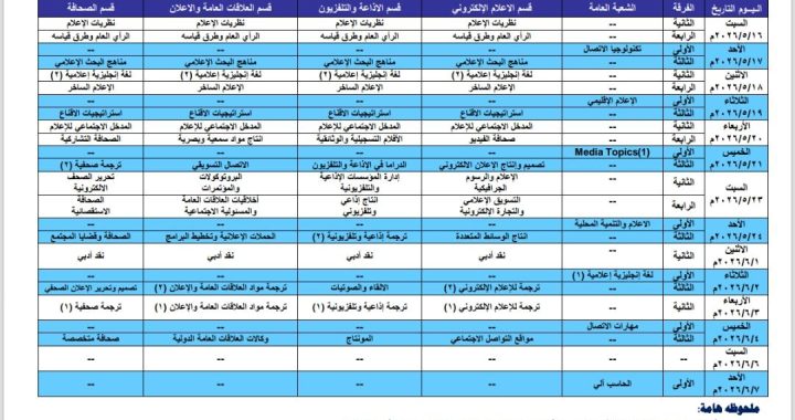 جدول الامتحانات النظرية والعملية لنهاية الفصل الدراسي الثاني (دور مايو/يونيو) للعام 2025/2026م بكلية الاعلام وتكنولوجيا الاتصال – جامعة قنا