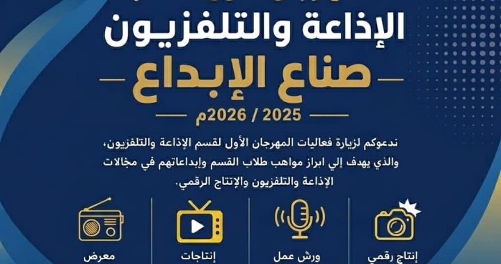 وفي إطار حرص الجامعة على دعم الإبداع الطلابي وتنمية مهارات العمل الإعلامي المرئي والمسموع، يدعوكم قسم الإذاعة والتلفزيون بكلية الإعلام وتكنولوجيا الاتصال – جامعة قنا، لحضور فعاليات المهرجان الأول للقسم تحت شعار “صناع الإبداع” للعام الجامعي 2025 / 2026، يأتي هذا المهرجان ليكون منصة مميزة لعرض مواهب طلاب القسم، وإبداعاتهم في مجالات الإذاعة، والتلفزيون والإنتاج الرقمي، من خلال محتويات إذاعية ، وإبداعات تلفزيونية، وحوارات ملهمة، وتجارب إنتاج رقمي متكاملة.