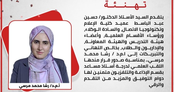 يتقدم السيد الأستاذ الدكتور / حسين عبد الباسط عميد كلية الإعلام وتكنولوجيا الاتصال، والسادة الوكلاء, ورؤساء الأقسام العلمية، وأعضاء هيئة التدريس والهيئة المعاونة, والإداريون والطلاب, بخالص التهاني والتبريكات إلى ا.م.د / رشا محمد مرسى .. بمناسبة صدور قرار منحها اللقب العلمي لدرجة أستاذ مساعد بقسم الإذاعة والتلفزيون متمنين لها دوام التوفيق والمزيد من التقدم والرقي