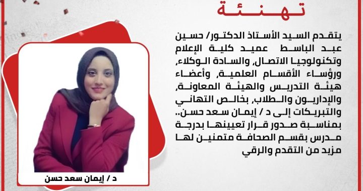يتقدم السيد الأستاذ الدكتور/ حسين عبد الباسط عميد كلية الإعلام وتكنولوجيا الاتصال، جامعة قنا، والسادة الوكلاء، ورؤساء الأقسام العلمية، وأعضاء هيئة التدريس والهيئة المعاونة، والإداريون والطلاب، بخالص التهاني والتبريكات إلى الدكتورة / ايمان سعد، بمناسبة صدور قرار تعيين سيادتها في درجة مدرس بقسم الصحافة كلية الإعلام وتكنولوجيا الاتصال، متمنين لها مزيد من التقدم والنجاح.