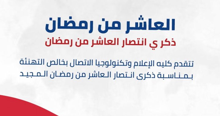 كلية الإعلام جامعة قنا تهنئ القيادة السياسية ورجال القوات المسلحة وجموع الشعب المصري بمناسبة ذكرى انتصار العاشر من رمضان المجيدة، والتي ستظل رمزاً خالداً للبطولة وأسمى معاني التضحية والعزيمة والإرادة، التي سطرها أبطال قواتنا المسلحة، وستظل انتصارات العاشر من رمضان مصدر فخر واعتزاز للأجيال القادمة ، ومصدر إلهام لهم في الحفاظ على وطننا الغالي مصر والسعى بكل تفاني و إخلاص لازدهاره ورفع شأنه بين الأمم.