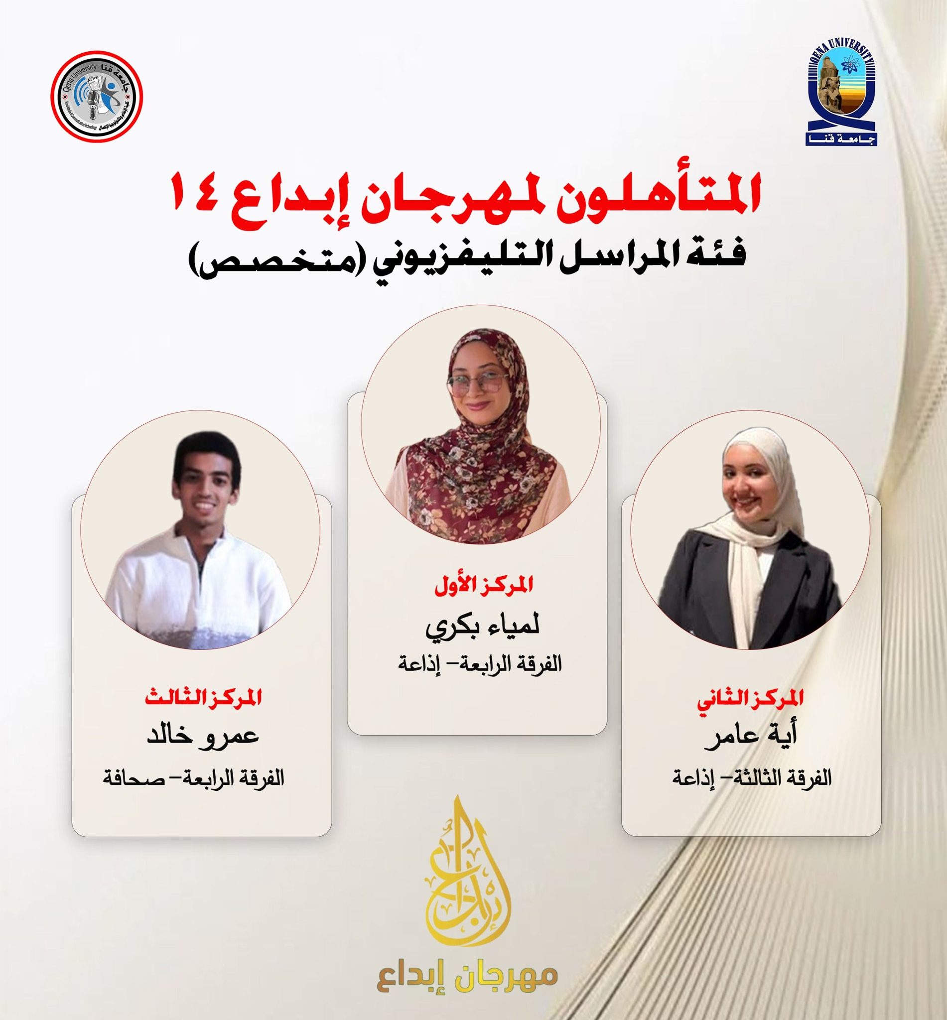 إعلان نتيجة تحكيم مسابقة المراسل التلفزيوني (غير متخصص) المؤهلة لمهرجان إبداع 14 لشباب الجامعات، الذي تنظمه وزارة الشباب والرياضة بالتنسيق مع وزارة التعليم العالي.