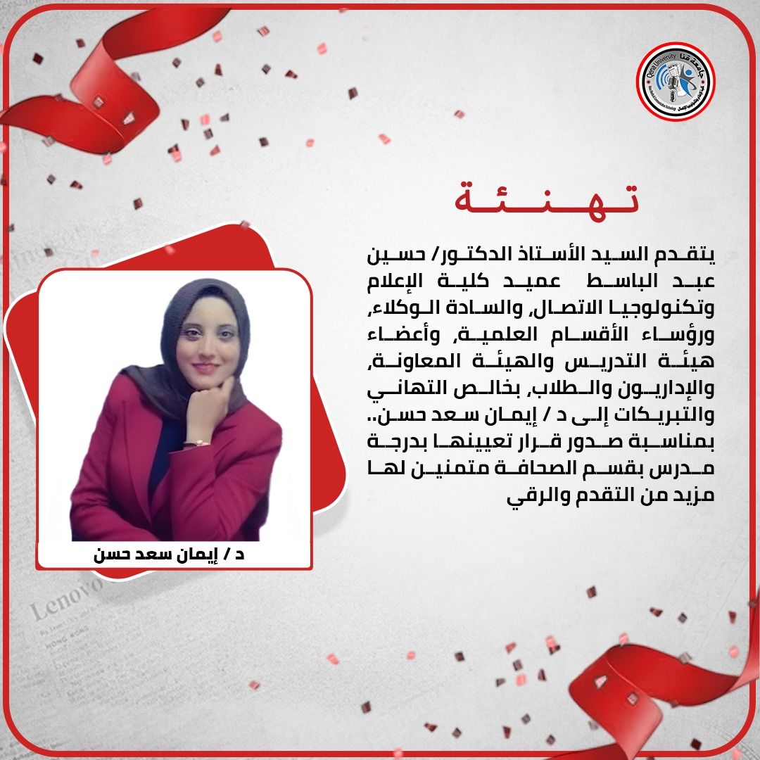 يتقدم السيد الأستاذ الدكتور/ حسين عبد الباسط عميد كلية الإعلام وتكنولوجيا الاتصال، جامعة قنا، والسادة الوكلاء، ورؤساء الأقسام العلمية، وأعضاء هيئة التدريس والهيئة المعاونة، والإداريون والطلاب، بخالص التهاني والتبريكات إلى […]