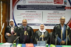 تحت رعاية السيد الاستاذ الدكتور احمد عكاوي رئيس الجامعة الأستاذ الدكتور محمد وائل نائب رئيس الجامعة لشؤون الدراسات العليا والبحوث الأستاذ الدكتور علي عبد الرحمن غويل عميد كلية الطب والأستاذ الدكتور السيد عبدالحميد أحمد وكيل الكلية لشئون الدراسات العليا والبحوث بمقر المبنى الأدارى لكلية الطب يوم الاربعاء الموافق. ١٥- ٤ – ٢٠٢٦ تم مناقشة رساله الدكتوراة المقدمة من الطبيبة مغربية حسين تحت عنوان
