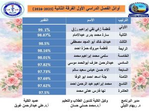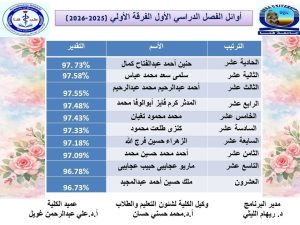 يسعد إدارة الكلية أن تتقدم بخالص التهنئة والتقدير لأبنائنا الطلاب العشر الأوائل بالفرق الثلاثة للعام الجامعي ٢٠٢٥-٢٠٢٦م، تقديرًا لتفوقهم الدراسي وتميزهم المشرف الذي يعكس جهدهم واجتهادهم طوال العام الدراسي.