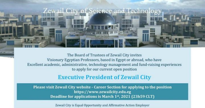 أعلنت وزارة التعليم العالي والبحث العلمي، اليوم الاثنين، عن فتح باب التقدم لشغل وظيفة الرئيس التنفيذي لمدينة زويل للعلوم والتكنولوجيا، اعتبارا من 25/1/2021 وحتى 1/3/2021.
