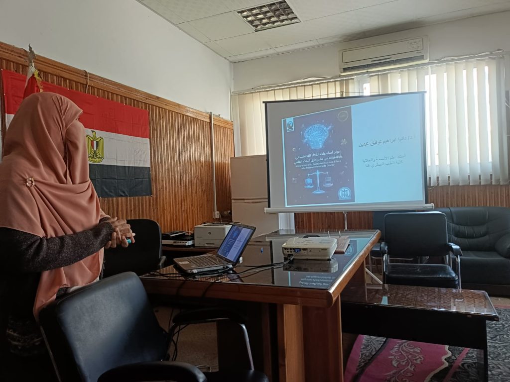 وذلك لفحص المقترح المقدم من السيدة أ.د/ داليا إبراهيم توفيق محمدين الاستاذ بالكلية لإدراج اساسيات الذكاء الاصطناعي واخلاقياته بالإضافة الى تطبيقاته العملية ضمن المنهج الخاص بمقرر طرق البحث العلمي لطلاب الدراسات العليا بالكلية والذي يهدف الى تطوير قدرات الخريجين التنافسية باستخدام الذكاء الاصطناعي المسئول عن طريق تطوير المادة العلمية والتدريب العملي المكثف وتحديث آليات التقييم.