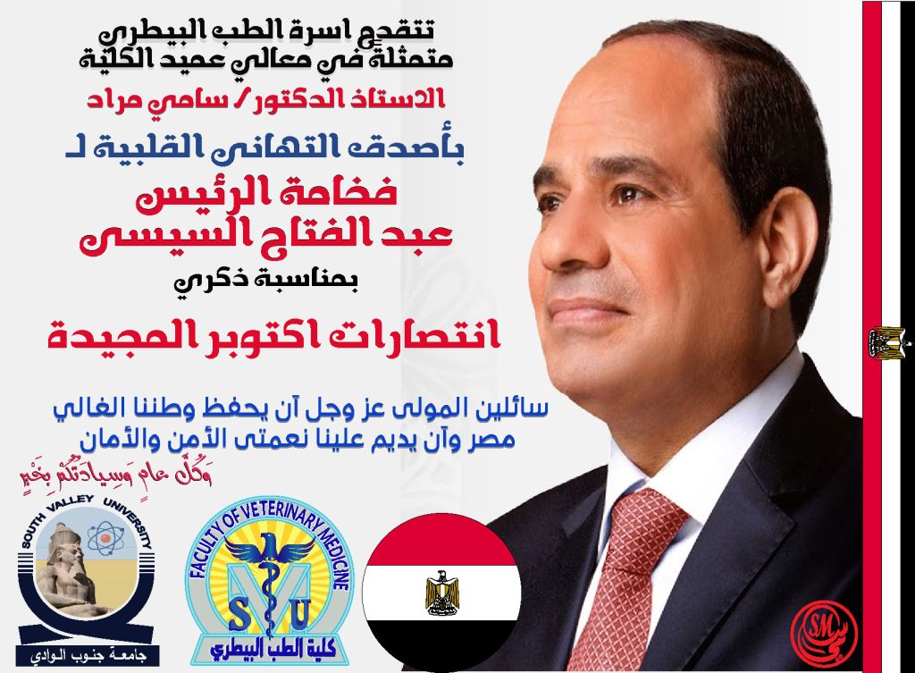 يسرني، بالأصالة عن نفسي وبالنيابة عن أسرة كلية الطب البيطري بجامعة جنوب الوادي من أعضاء هيئة التدريس والهيئة المعاونة والعاملين والطلاب، أن أتقدم إلى فخامتكم بأصدق التهاني وأطيب التمنيات بمناسبة احتفالات انتصارات السادس من أكتوبر المجيدة.