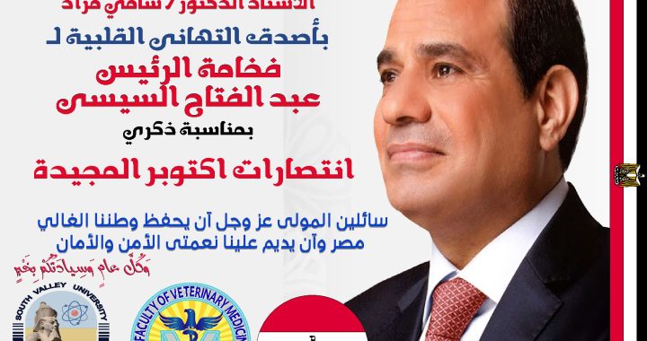 يسرني، بالأصالة عن نفسي وبالنيابة عن أسرة كلية الطب البيطري بجامعة جنوب الوادي من أعضاء هيئة التدريس والهيئة المعاونة والعاملين والطلاب، أن أتقدم إلى فخامتكم بأصدق التهاني وأطيب التمنيات بمناسبة احتفالات انتصارات السادس من أكتوبر المجيدة.