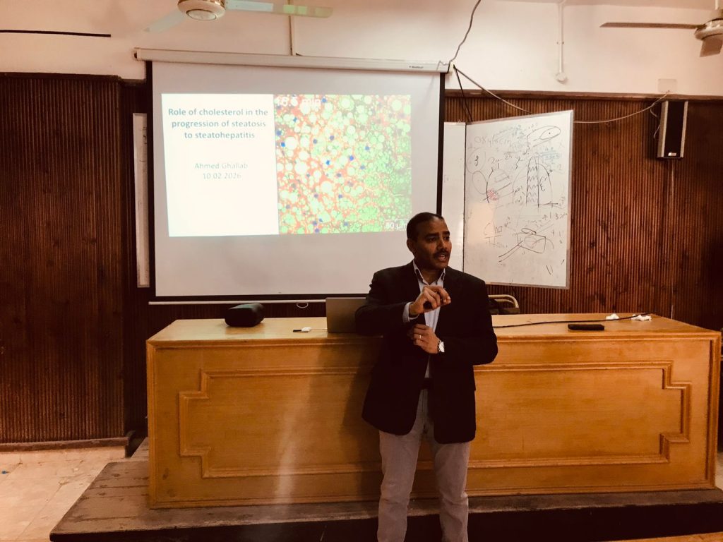 مرض الكبد الدهني المرتبط بخلل التمثيل الغذائي (MASLD) – المعروف سابقًا باسم مرض الكبد الدهني غير الكحولي (NAFLD) – هو حالة كبدية مزمنة تتميز بتراكم الدهون الزائدة في الكبد (التدهن الكبدي) مصحوبًا بعامل خطر واحد على الأقل من عوامل الخطر الأيضية القلبية (مثل السمنة، وداء السكري من النوع الثاني، وارتفاع ضغط الدم) في غياب استهلاك كبير للكحول. يُقدر الانتشار العالمي لهذا المرض بنحو 38% من سكان العالم البالغين، وهو في ازدياد مستمر. لا تزال الآلية الدقيقة لتطور المرض من التدهن الكبدي الحميد إلى التهاب الكبد الدهني غير معروفة، وهناك حاجة ماسة لتطوير استراتيجيات علاجية. باستخدام نموذج فأر لتطور مرض الكبد الدهني، أظهر الفريق البحثي للأستاذ الدكتور احمد غلاب وجود صلة بين ركود الصفراء وتطور مرض الكبد الدهني. على وجه التحديد، نُبين أن ارتداد الصفراء من القنوات الصفراوية إلى خلايا الكبد يُحفز تطور المرض من التدهن الكبدي الحميد إلى التهاب الكبد الدهني. ومن المثير للاهتمام أن هذا النقل العكسي للعصارة الصفراوية إلى خلايا الكبد يحدث نتيجة ترسب كميات كبيرة من الكوليسترول على الغشاء القنيوي لخلايا الكبد. واستنادًا إلى هذه الآلية، صمم فريق البروفيسور غلاب تدخلات محددة تستهلك الكوليسترول في خلايا الكبد. ومن اللافت للنظر أن خفض تركيز الكوليسترول في أغشية خلايا الكبد قد ساهم في علاج التهاب الكبد الدهني. وإذا ما تم تطبيق هذه التدخلات بنجاح ، فستوفر علاجًا للتحدي السريري العالمي المتمثل في التهاب الكبد الدهني.
